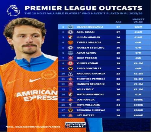 德转统计本赛季英超0出场球员身价榜: