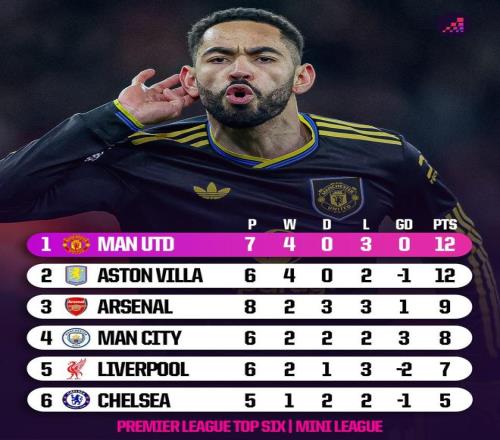 1、曼联 7战4胜3负 净胜球0 12分