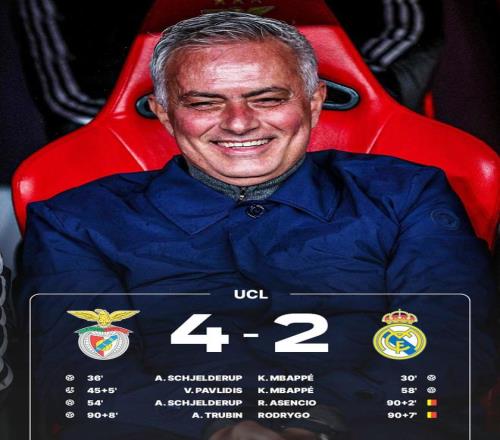 最后阶段皇马疯狂压上,却始终无法再度破门;伤停补时阶段,情绪彻底压垮了理智,阿森西奥、罗德里戈接连染红,被直接罚下。第97分钟,本菲卡任意球吊入禁区,门将特鲁宾冲到前场抢点头球破门,本菲卡4-2皇马,这一夜穆里尼奥又创造了历史,62岁的小老将硬是把本菲卡送进附加赛。